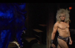 This flick starts things off like any other horror film: it packs a van-full of middling attractive people into a creepy abandoned house, where, following several bouts of vigorous lovemaking, victims are picked off one at a time, leading to a final confrontation between the main good guy and an overblown heavy. But where most genre movies utilize hapless teens and a sharp-object-wielding killer, Rock 'n' Roll Nightmare gives you a metal band menaced by Muppets. Straightforward enough, right? Hah. Wait until you get to the conclusion. I can't recall a film that set the table as a straight-arrow horror flick (relatively, of course; again, puppets) then suddenly switched tracks at the end with a denouement I'm still grappling to decipher. Forget switching tracks: the reveal in this movie is a dimensional-portal-hopper. It doesn't make any sense, and renders everything that preceded it moot, yet I don't know if I'd prefer any other ending. The final 10 minutes are devoted to a fight between Jon Mikl Thor and a herky-jerky puppet devil as they grapple back and forth, stage lights (?!?) bathing them in a neon glow, perspiration and glitter shining off of Thor's breasts, and pounding hair metal music in the background. It takes forever, and, like lots of other sequences in the film, could have been trimmed to 1/8 its length. But how often do you see a Canadian '80s rocker in a cape punching a demon in the face? If you answered "Every day, why?" then I wish I could be you. Before we reach this glorious conclusion, there's some killin' and lovin' that needs to be done. And rockin'. Can't forget about the rockin'. That's about it, too for the bulk of the film. A dude has a bloody arm rip its way through his gut, another gets suffocated by a drooling, scaly demon-girl, a couple gets jumped by the aforementioned kid-monster. The deaths are far from graphic and mentionable only because of the cheap, playful make-up effects work involved. The sex scenes, while copious, are pretty reserved, with only the shower tryst between Triton and his girlfriend marginally revealing (in the commentary track, Thor talks of his willingness to go fully nude in the scene and how he apologized in advance to his scene partner if he "poked her"). Finally, there are the extensive rock scenes, full-on music videos panning over Thor rocking out, lights flashing, and the nipply keyboardist pounding away.