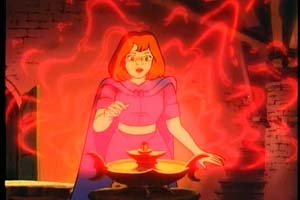 As the group's leader, the blonde, blue-eyed Hank is the staunch "good guy" of the series. Aside from the fact that his energy-firing bow is cool as hell, he can sometimes come across as boring. Fortunately, the writers do give him some examples to shine. The episode "The Traitor" had me worried at first, with its emphasis on cute, fuzzy Ewok-like creatures, but then it got very serious when Hank was put in the position of selling out his teammates to Venger's forces, breaking the others' hearts. The episode "The Dragon's Graveyard," considered a favorite by many, has the pressure getting to Hank, to the point where he turns his back on Dungeon Master and instead decides to take an offensive against Venger. Although it's never said, you can tell he's so filled with anger that he intends to go the distance and murder Venger. Here we have the show dealing with some dark, serious themes. Even though you know in your heart that Hank will still be on the right and true by the end, you have to give the writers credit for putting him through the wringer like that. Diana is the character with perhaps the least amount of development over the course of the series. It's not until the 21st episode that we get a script with her in the spotlight. Mostly, she's the cool-headed voice of reason. When the others don't want to head into some dangerous cave or dungeon, Diana is there to remind them of the importance of what they're doing and why they are there. She also has a sharp wit, and she usually has a comeback ready for any of Eric's sarcastic quips. As far as her powers are concerned, her javelin staff is mostly used to help her cross great distances and reach otherwise unobtainable heights, but not as an offensive weapon. This is true of the weapons in general. The kids use them in defensive ways, almost never to directly harm anyone else. Part of this is no doubt because of standards and practices, but it also reinforces the characters as heroes. When Diana uses the staff to jump across a crevasse to separate her from an enemy, instead of using it to whop her enemy on the head, it shows what kind of person she is.