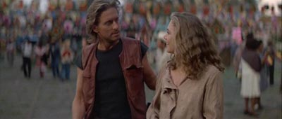And every little bit of this made the film work. Turner's "helpless romantic transformed into Oprah-clone female empowerment coordinator" should be a role model for most of the female leads in film these days. I mean, the beautiful woman who makes herself ugly and endures all kinds of maltreatment is getting a bit redundant right now. Considering that Turner almost lucked into the role (which was originally offered to fellow '80s eye candy actress Debra Winger), Turner does wonders in the role and it's hard to imagine anyone else. This has been one of, if not my favorite roles that Douglas has been in, and in knowing the family history, watching him transform himself from successful producer into charismatic actor and seeing that this was the role that essentially cemented his career transformation is still something to see. Zemeckis (along with Diane Thomas' screenplay) certainly helps to accentuate the moments that need it. Whether it's the "dumb luck" where Douglas finds almost any Colombian he encounters speaks near-perfect English or it's the chase scenes involving Turner, Douglas, and Danny DeVito (who plays one of the kidnappers), it's all action that's tight but not too tight, with more of a serial feel to it than other films since that time. Though the film was released on DVD way back when, the newer version includes some extra material, as opposed to the first release which had, well, not much. There are eight deleted scenes (that run about 19 minutes in length) which are surprisingly in anamorphic widescreen and all are in pretty good shape after all these years. Some are alternate takes of the same dialogue, so it's understandable why they were left out of the final cut. There's a new look back at the film featuring old and new interviews with the principals (what the hell is up with Michael's beard?) with the exception of Zemeckis, as they remember the fun on and off set at the time, along with the requisite thoughts on each other and their director. A quick look at Thomas' script and her life is discussed (Thomas died in a car crash in a Porsche that Douglas had bought for her), followed by some scene-specific remembrances by Douglas, Turner, and DeVito.